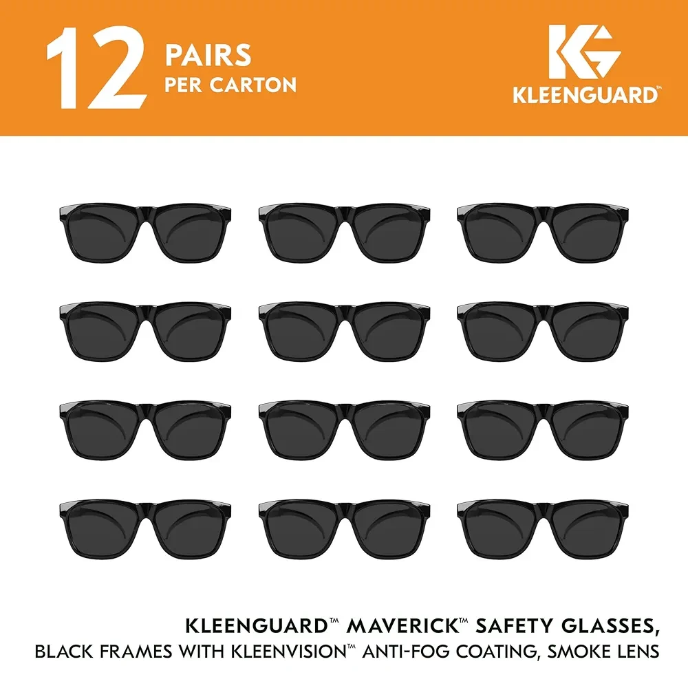 12 Pairs, KleenGuard V30 Maverick Safety Glasses; with KleenVision Anti-Fog Coating; Smoke Lenses; Black Frame; Unisex Sunglasses for Men and Women