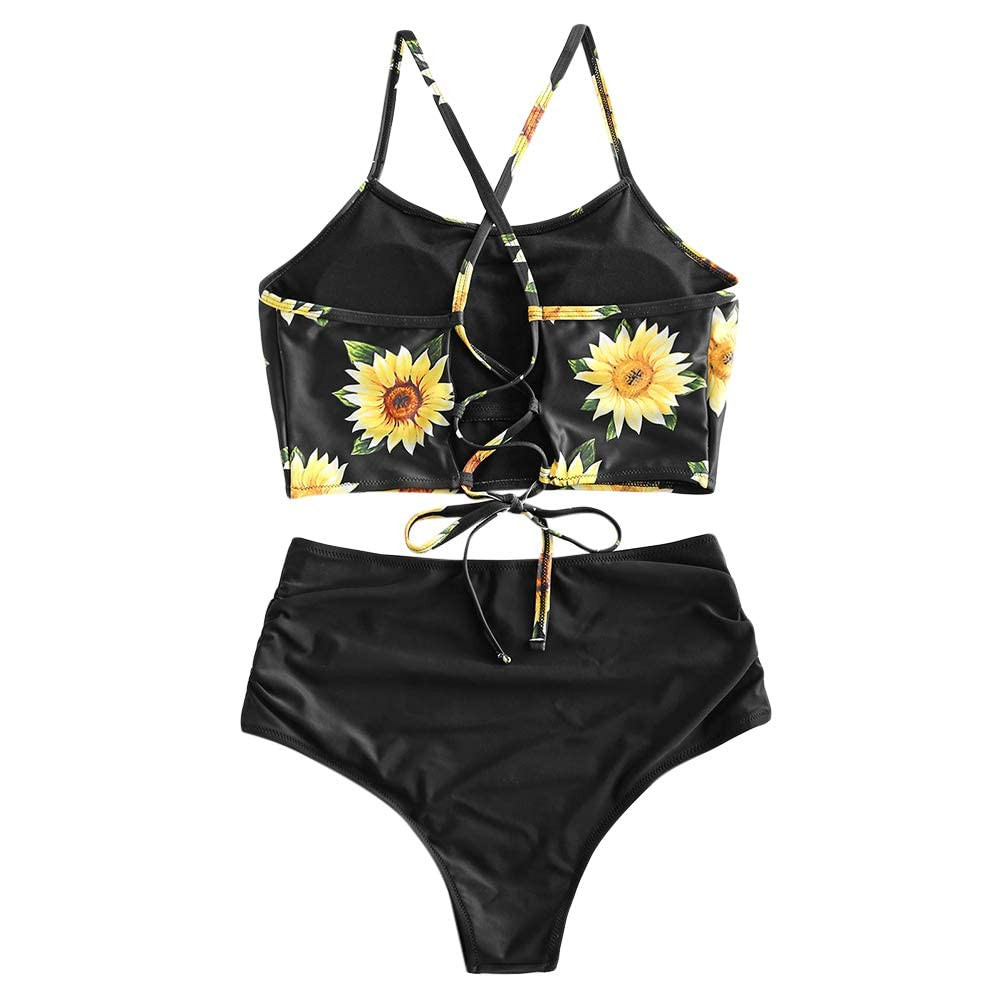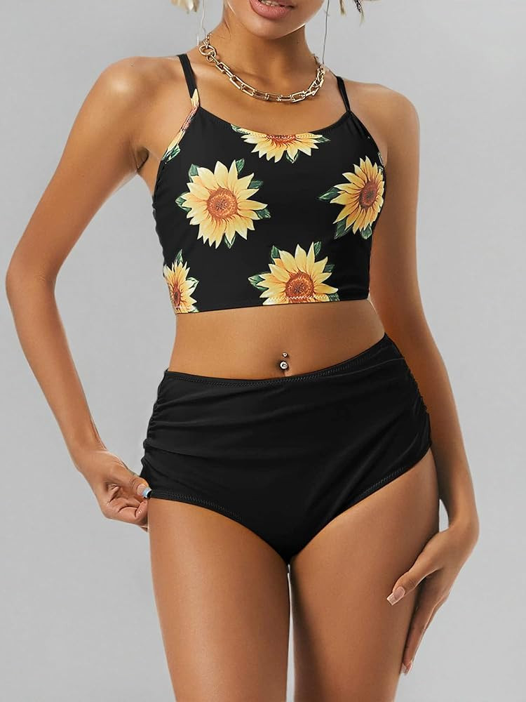 Two piece high coverage tankini set features balmy sunflower print, criss cross lace up straps, padded bra, ruched high rise bottoms hide the belly, our bikini set shows your body shape better