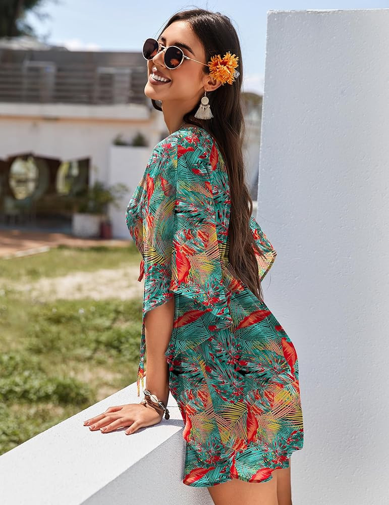 • Beach Cover Ups for Women: Deep V-neck, 3/4 sleeve, mini dress length. Tie Waist drawstring design, allowing you to adjust the fit to your liking
