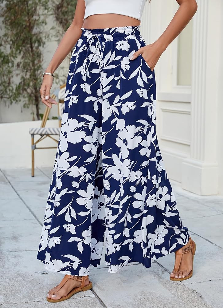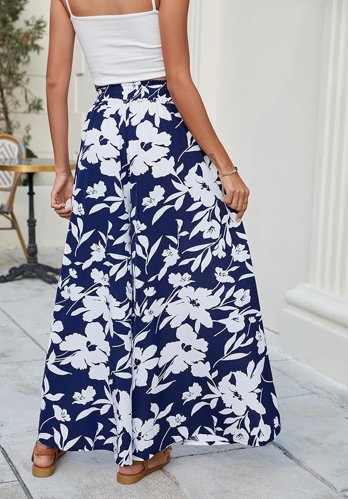 Women's Palazzo Pants Boho Floral Wide Leg Trousers Summer Beach High Waisted Flowy Pants with Pockets