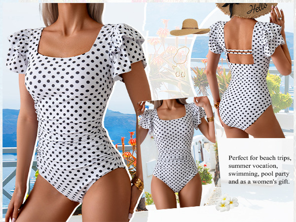 Ruffle One Piece Bathing Suit: The ruffled sleeve of this swimsuit can better cover the arms, making them look slimmer and longer. The square neck and hollow-out back design offers a sexy and vintage look, making you stand out in the crowd